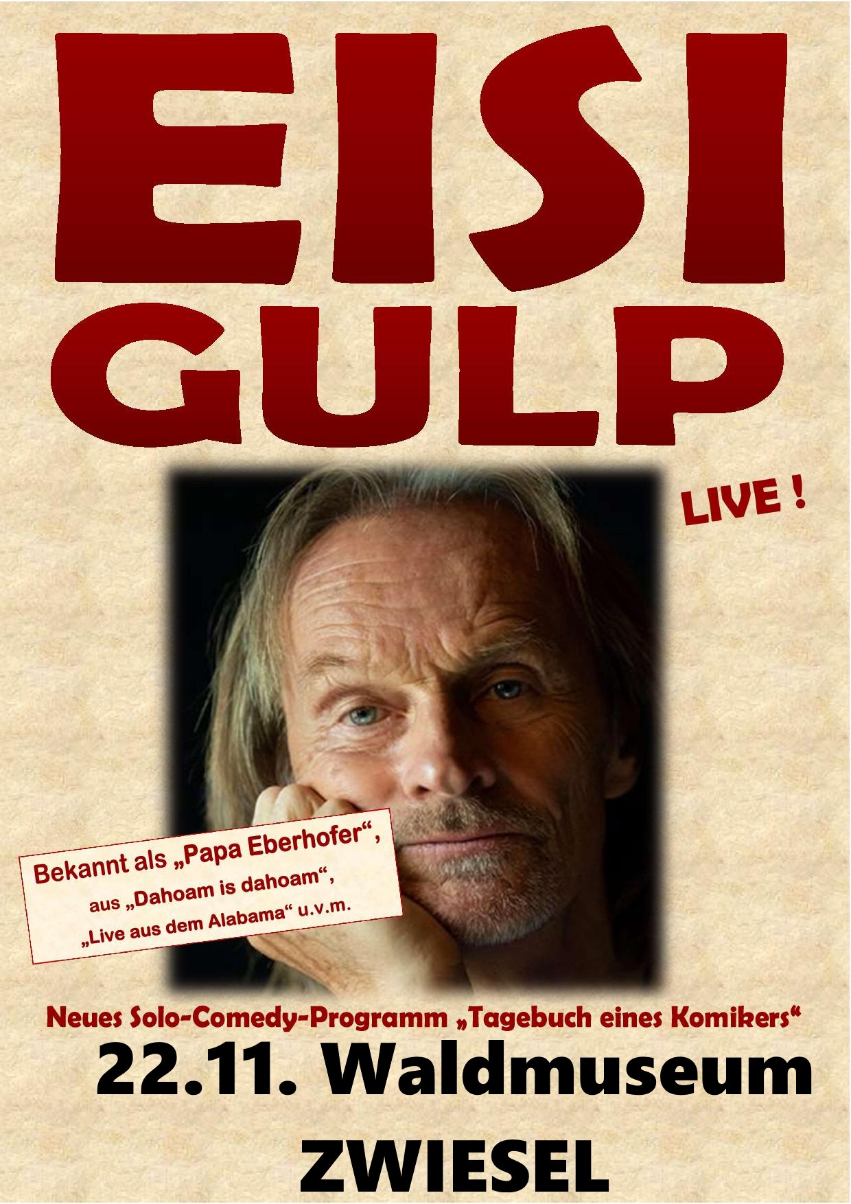 Spätestens seit den Eberhofer-Krimi-Verfilmungen kennt ihn wohl jeder als den kiffenden Film-Papa des Polizisten Franz Eberhofer. „Tagesbuch eines Komikers“ heißt sein neues Solo-Comedy-Programm, mit dem Eisi Gulp am Samstag, 22. November, im Waldmuseum auftritt. Nach vielen Jahren, in denen er vor allem als Film- und Theaterschauspieler aktiv war, meldet er sich nun nach längerer Abstinenz mit seinem brandneuen Programm als Stand-Up-Comedian zurück. Nach der hochgelobten Premiere bei den Luisenburg-Festspielen ist der Comedian seit 2024 im deutschsprachigen Raum mit „Tagebuch eines Komikers“ auf seiner Comeback-Tournee, deren erster Abschnitt in allen Städten ausverkauft war.
