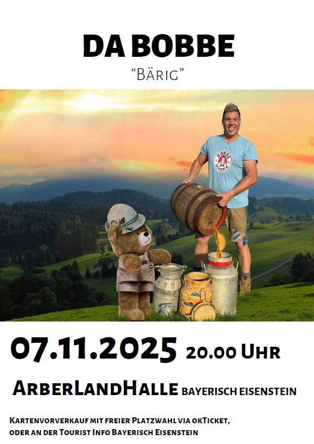 Da Bobbe mit seinem Programm „Bärig“ beginnt um 20:00 Uhr. Karten gibt es bei den üblichen Stellen von ok-ticket.de, in der Touristinfo Bayerisch Eisenstein.